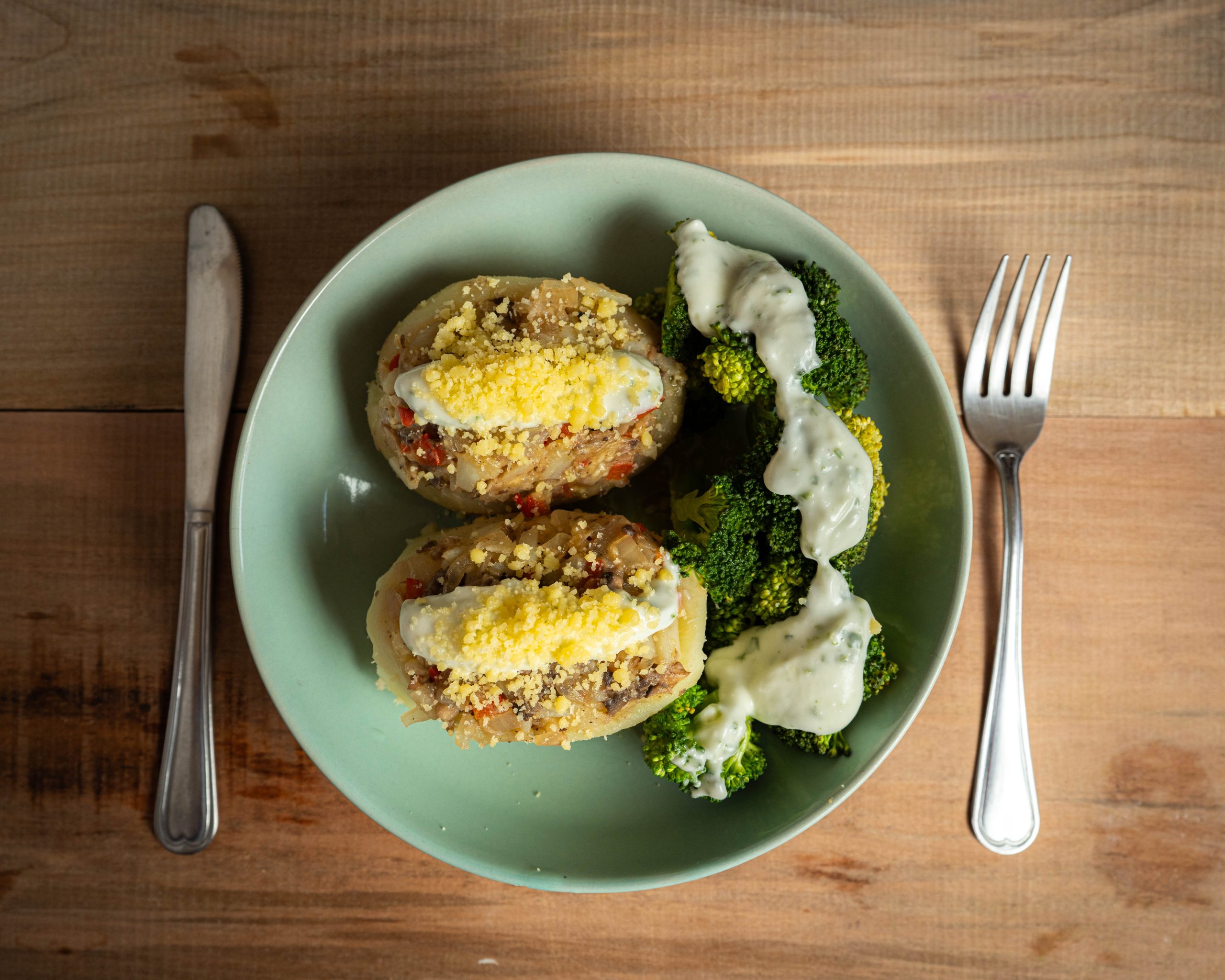 Papa rellena con champiñones y Brócoli en salsa de ajo