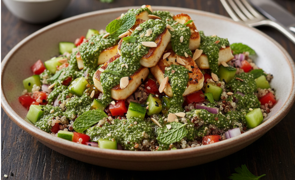 Ensalada de quinoa, queso cabra y pesto de menta